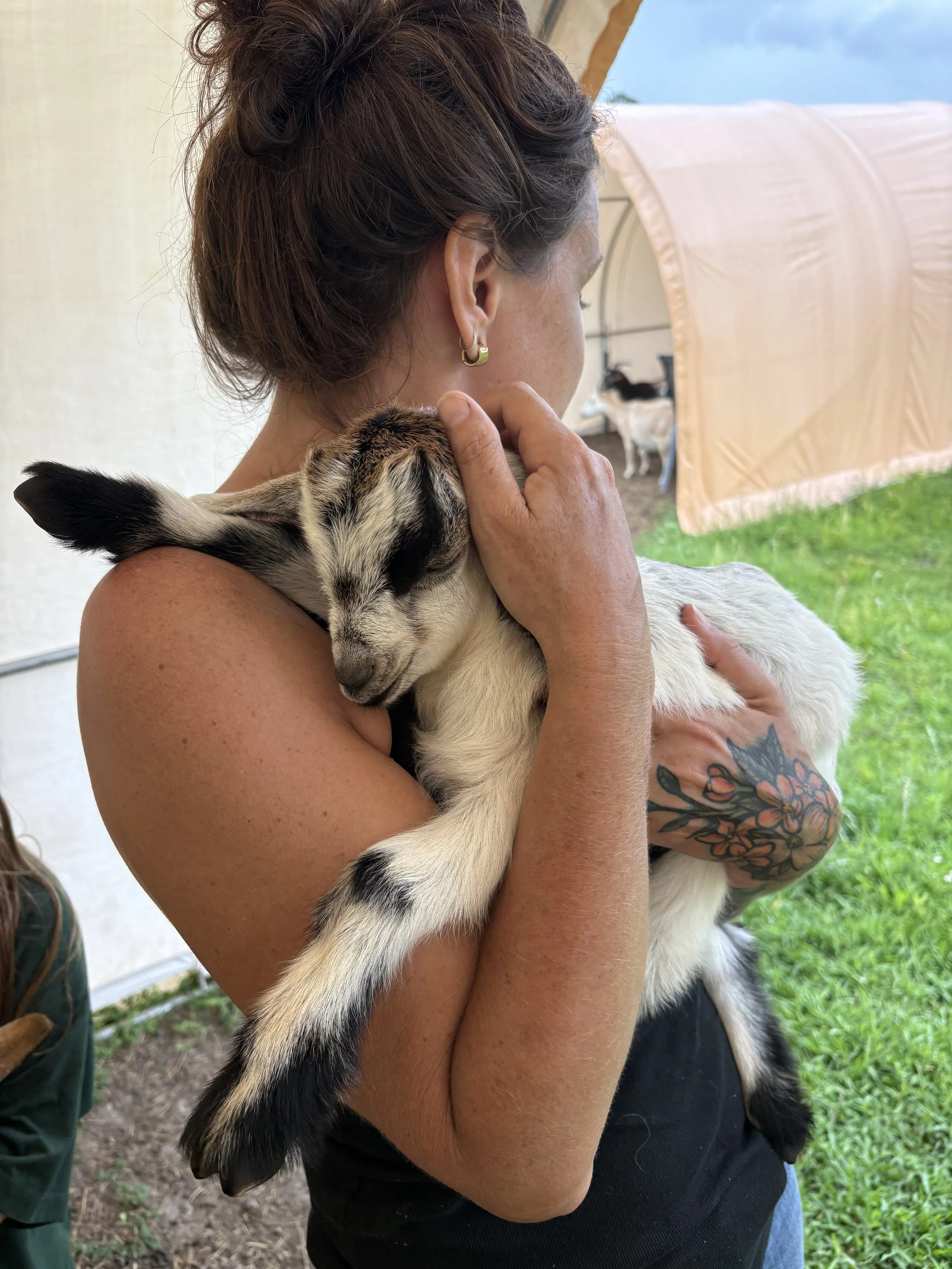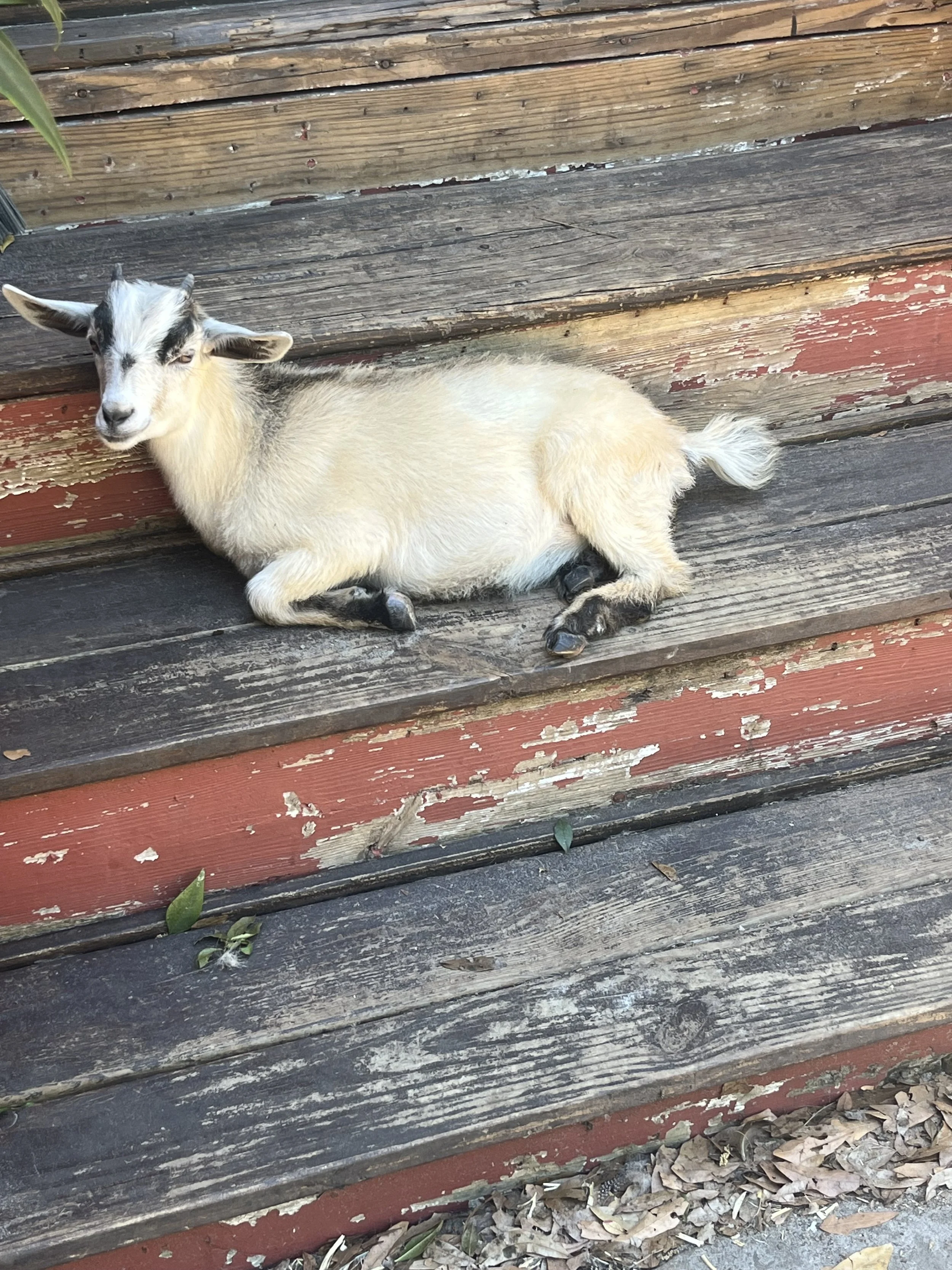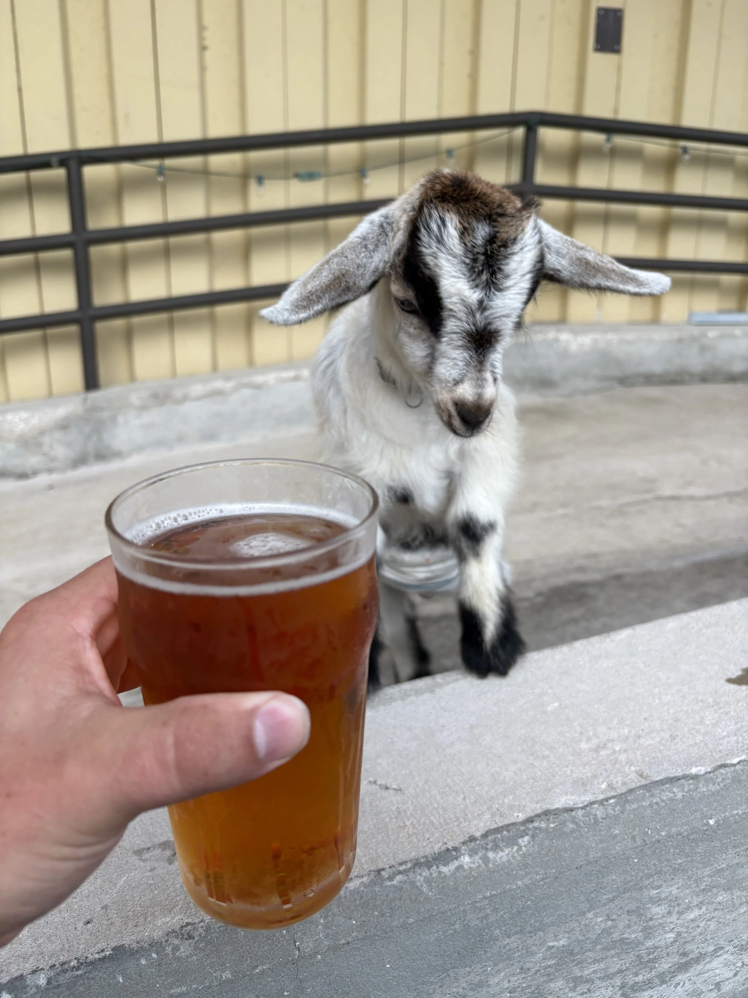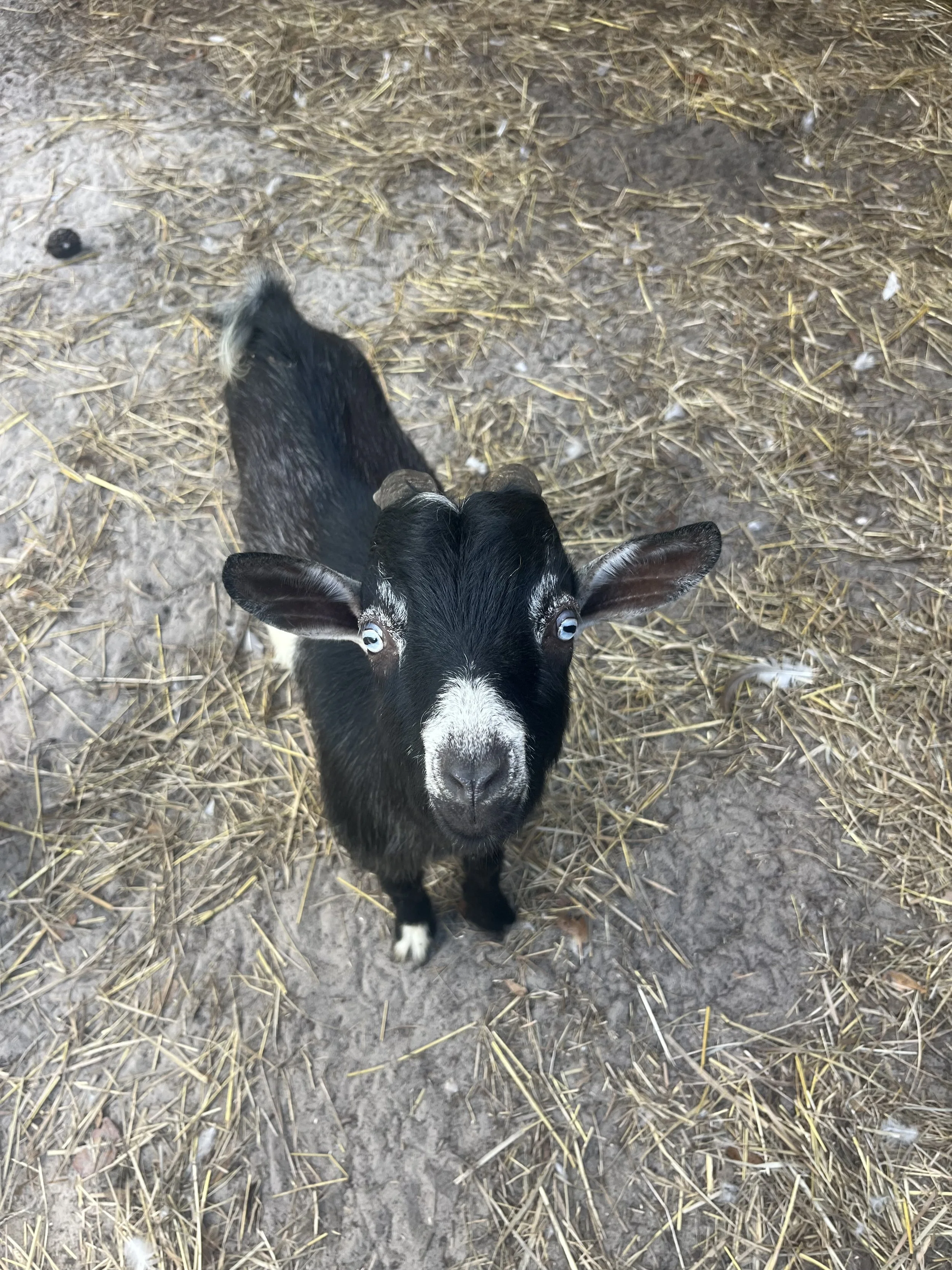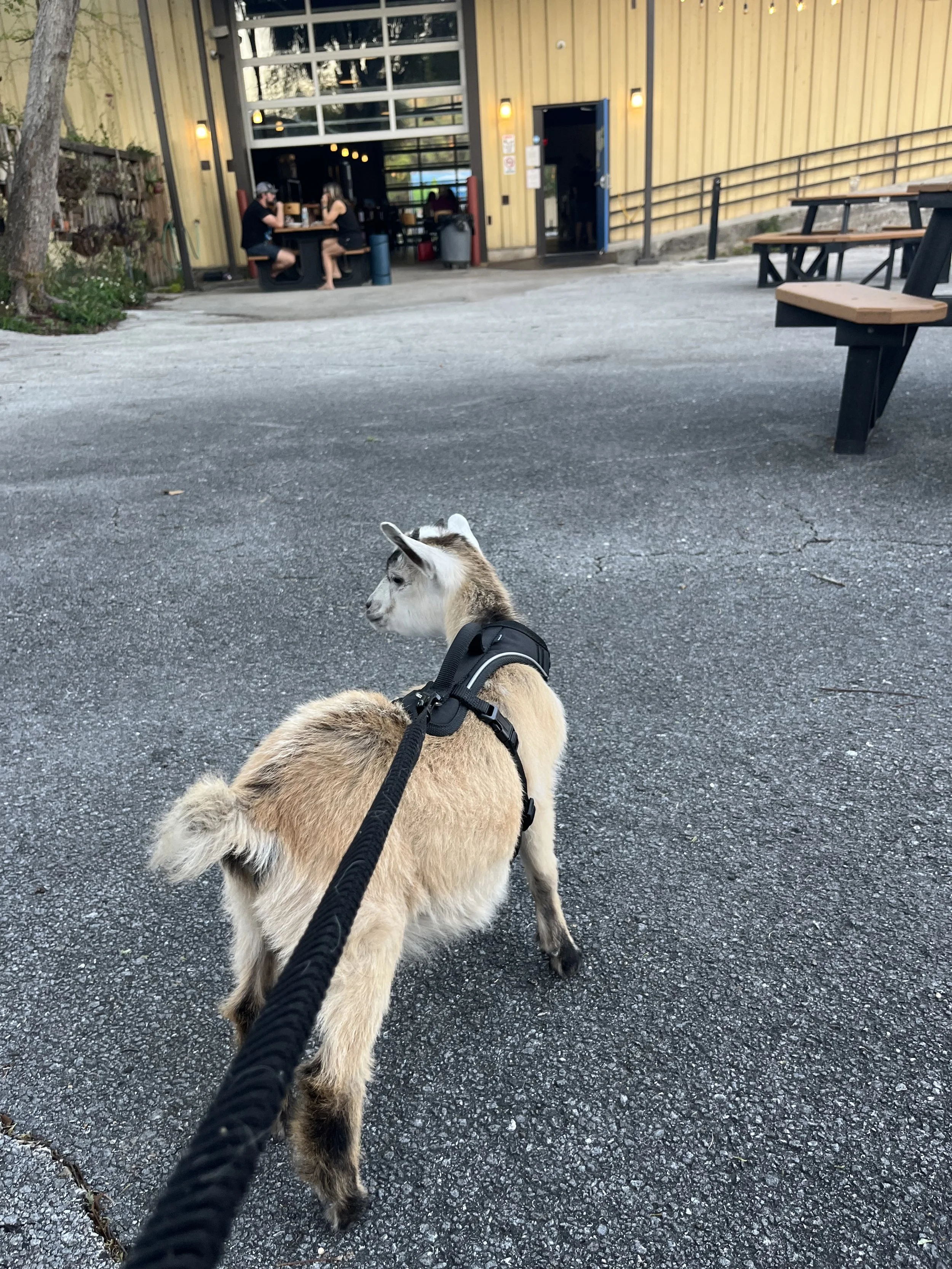Petey’s Beer & Wine Garden is named after our very first goat - Petey, a sweet white Nigerian Dwarf kid. We remember picking him up in January 2025 from a small farm outside of Bunnell, FL - he was so cute and small. It was cold outside, so we wrapped him up in a little blanket for our ride home.