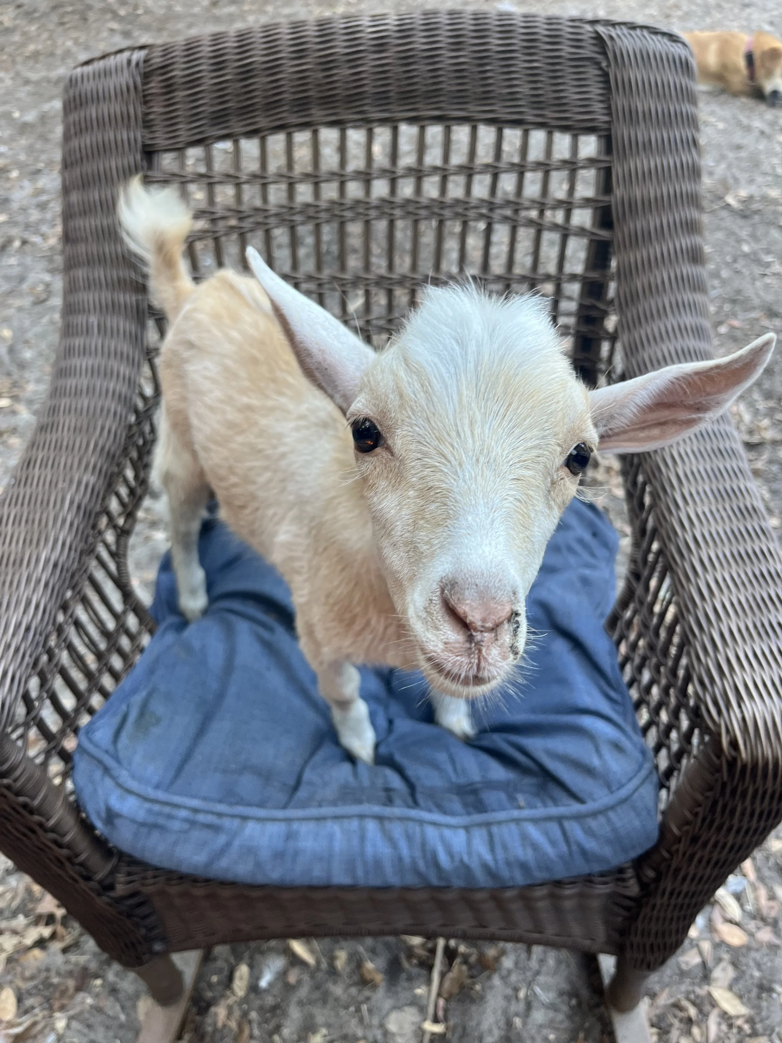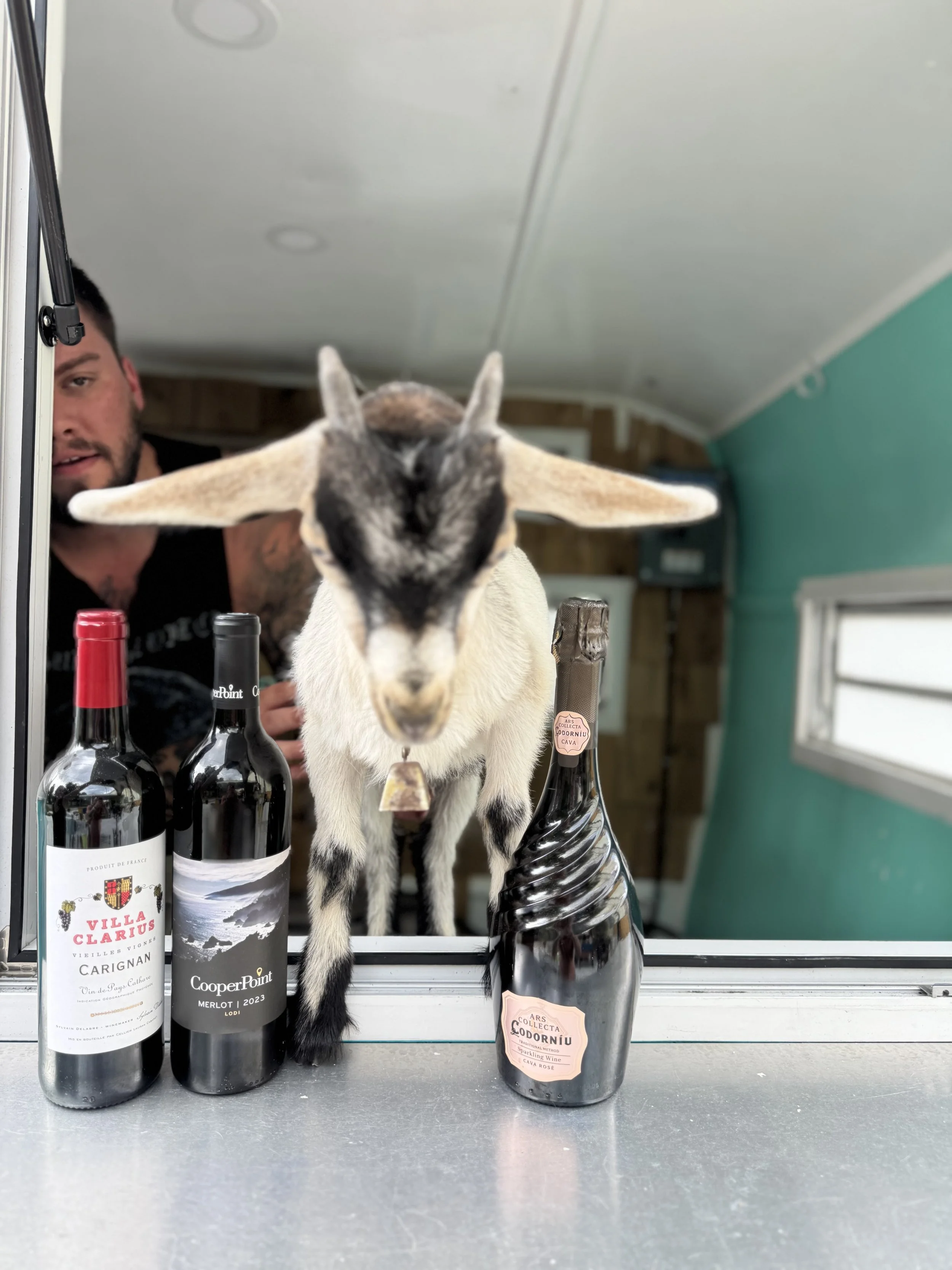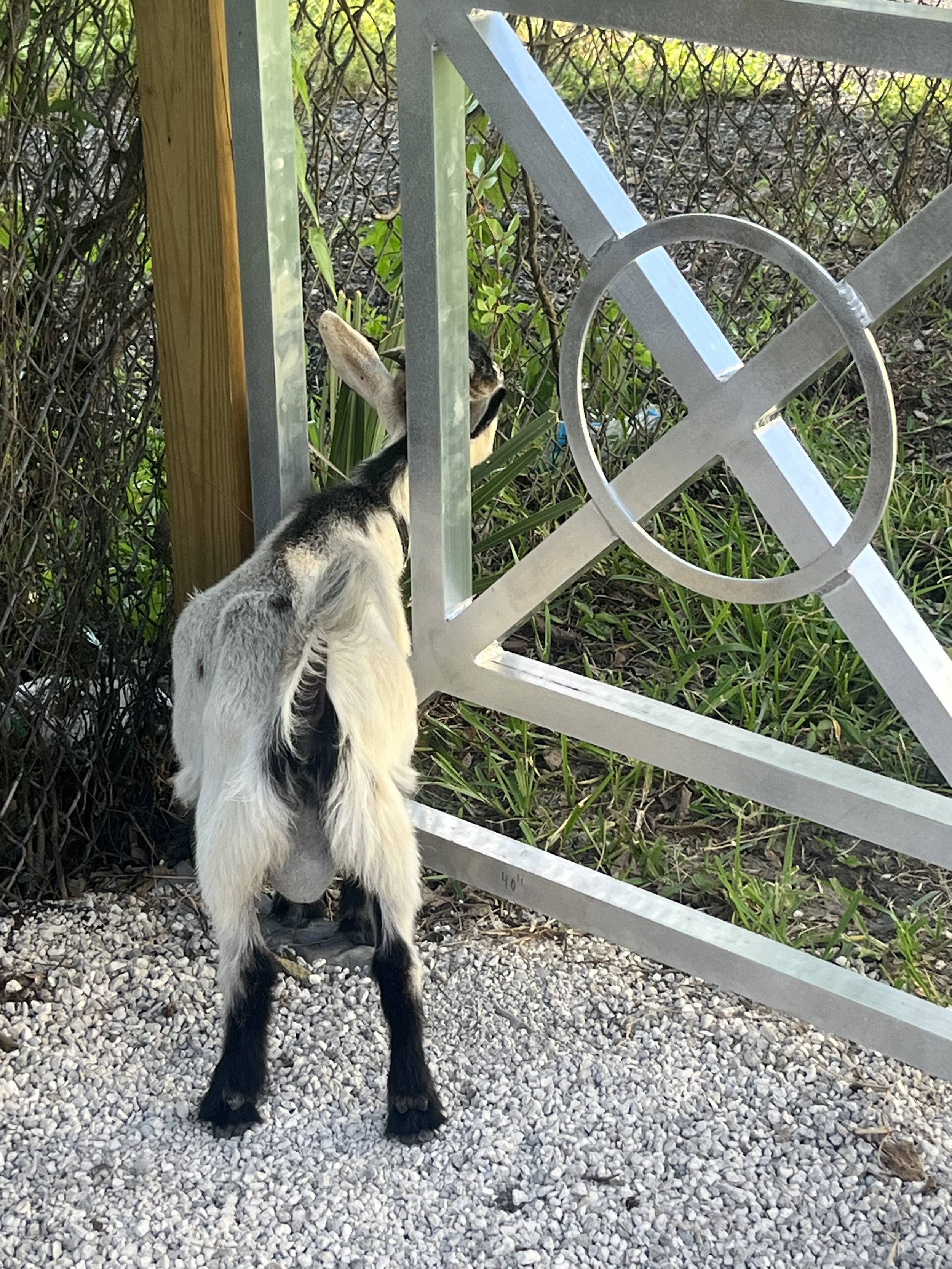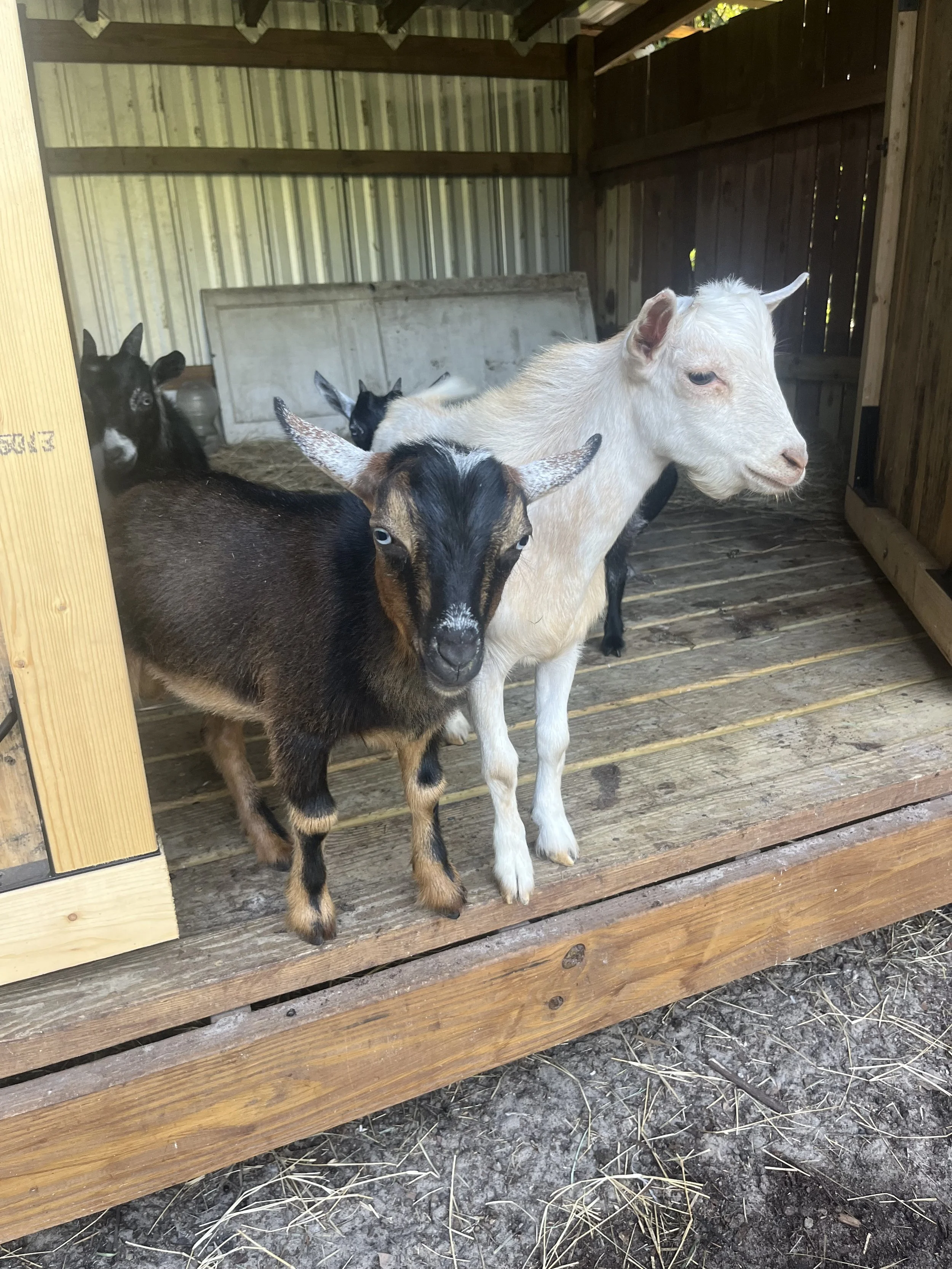 Petey’s Beer & Wine Garden is named after our very first goat - Petey, a sweet white Nigerian Dwarf kid. We remember picking him up in January 2025 from a small farm outside of Bunnell, FL - he was so cute and small. It was cold outside, so we wrapped him up in a little blanket for our ride home.