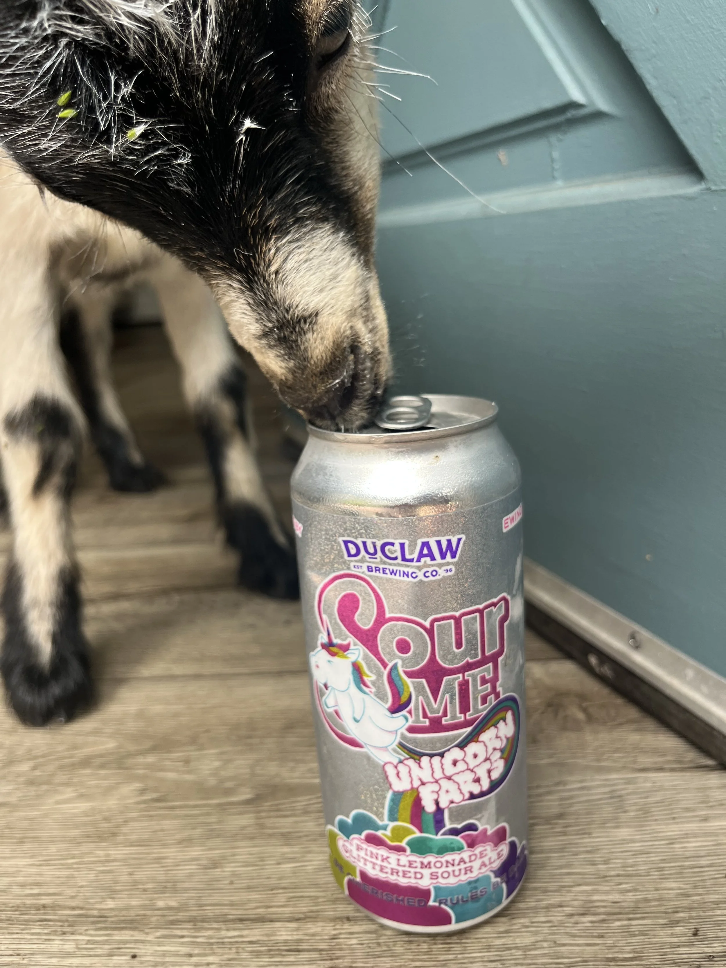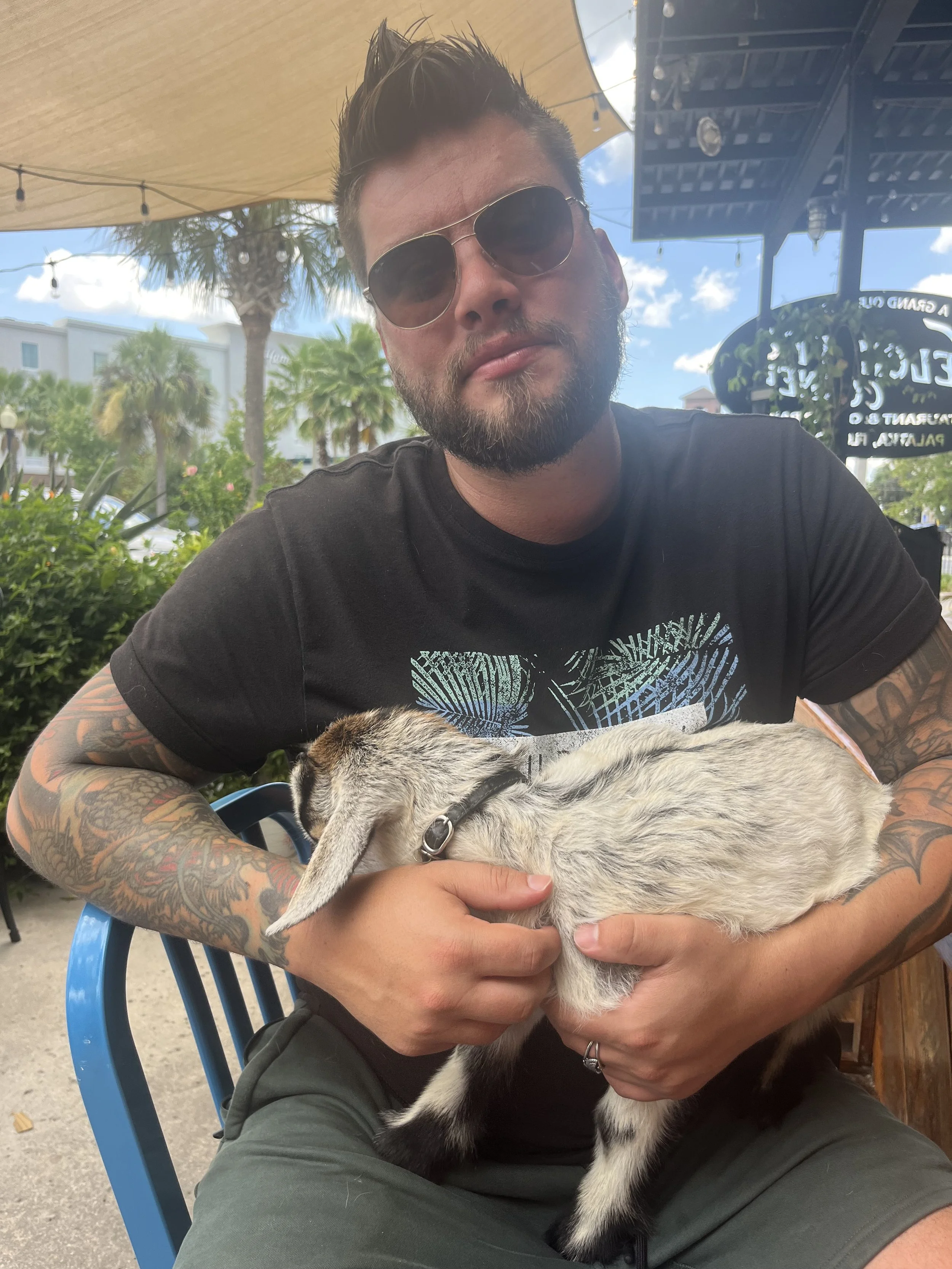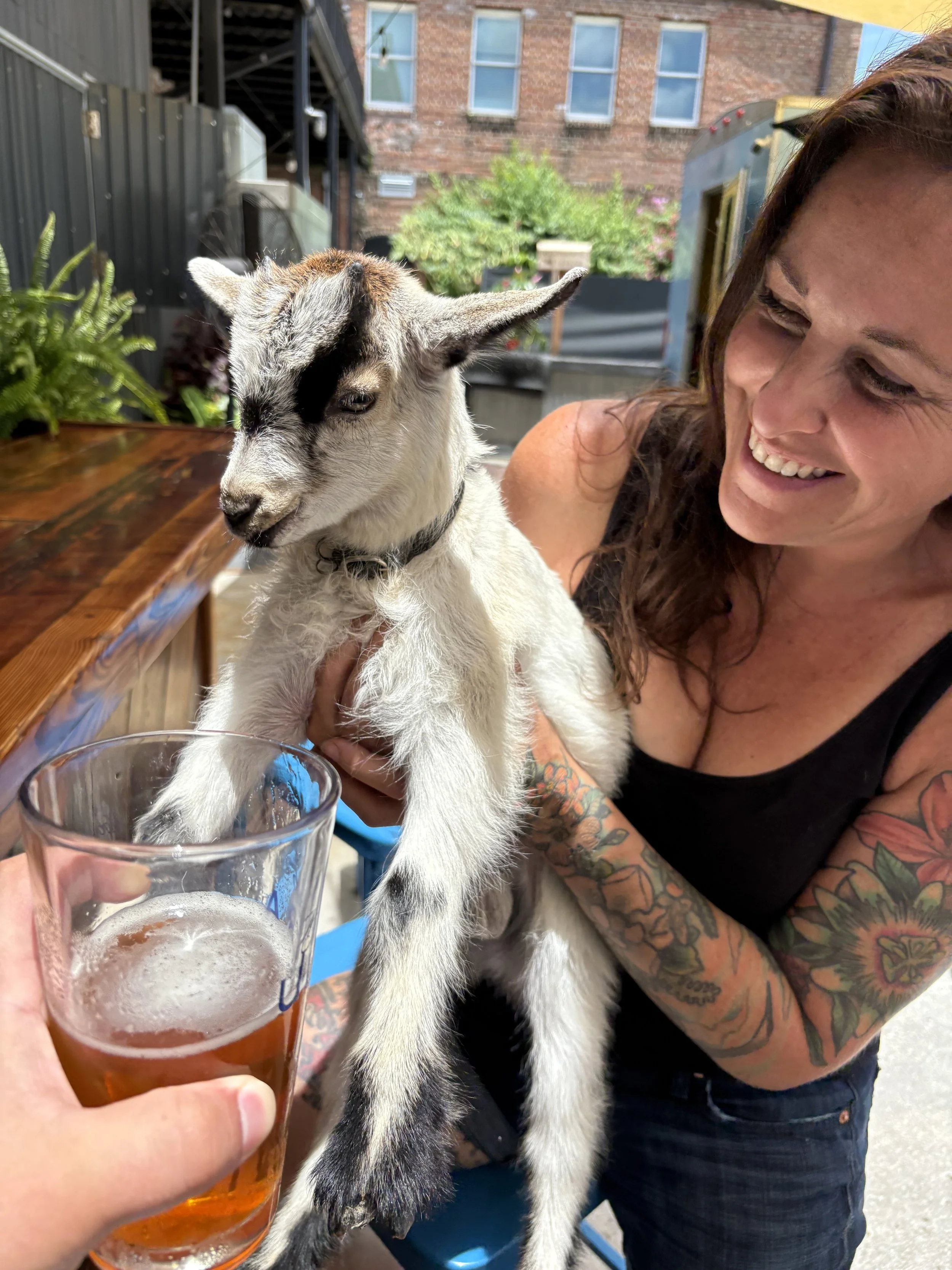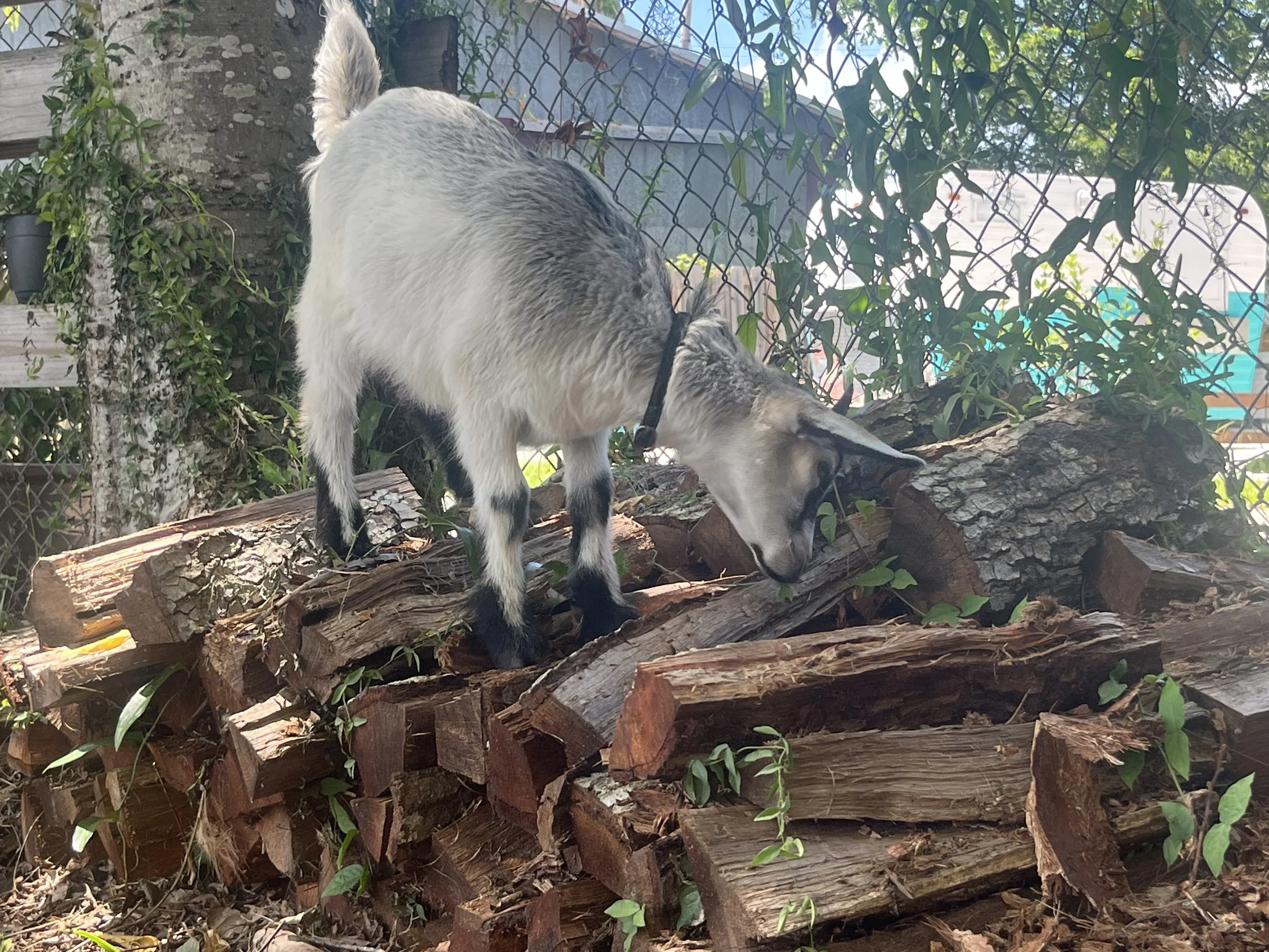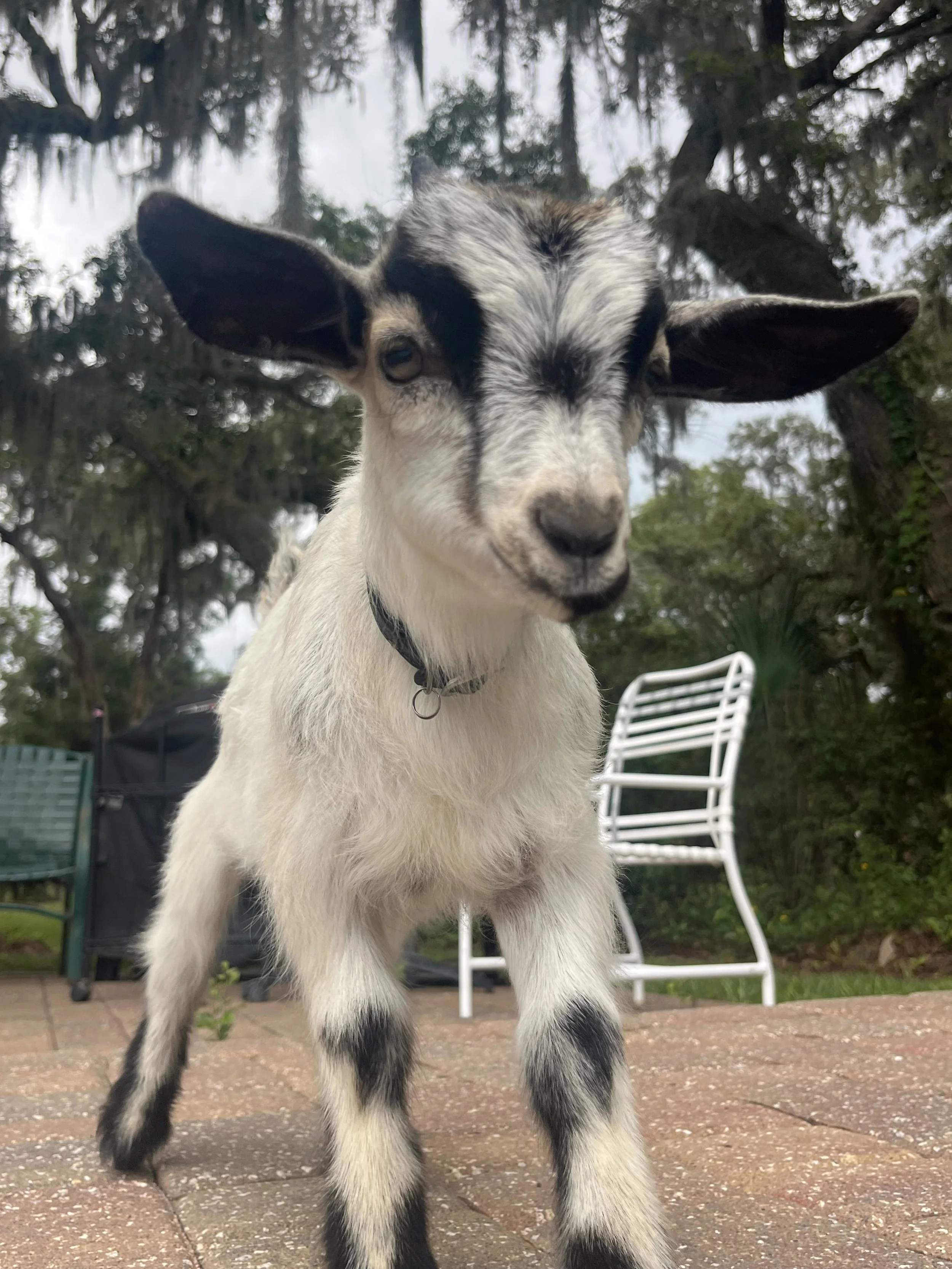 Petey’s Beer & Wine Garden is named after our very first goat - Petey, a sweet white Nigerian Dwarf kid. We remember picking him up in January 2025 from a small farm outside of Bunnell, FL - he was so cute and small. It was cold outside, so we wrapped him up in a little blanket for our ride home.